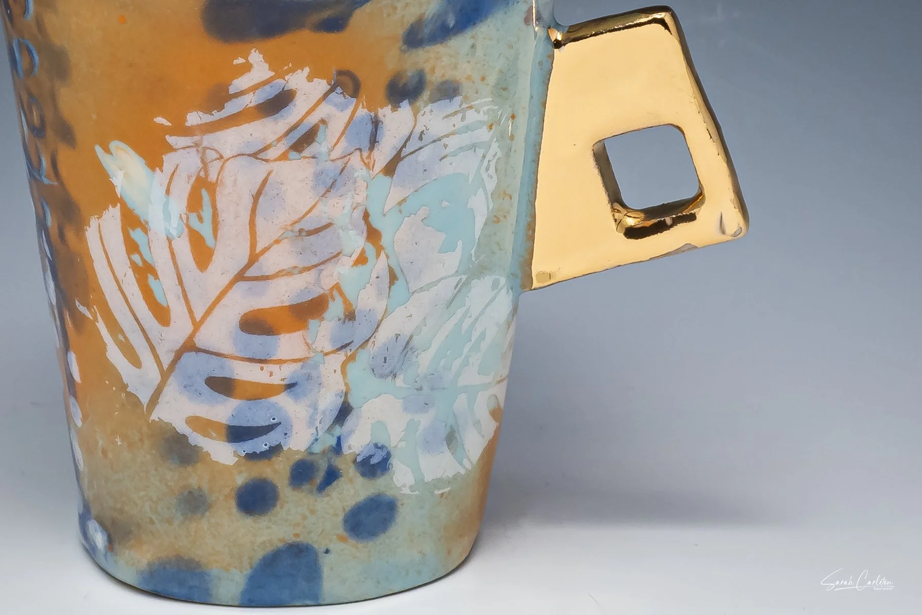 Mark applies multiple layers of glaze transfers to create unique patterns and colorful designs. Each cup is a unique expression of Mark’s craft.